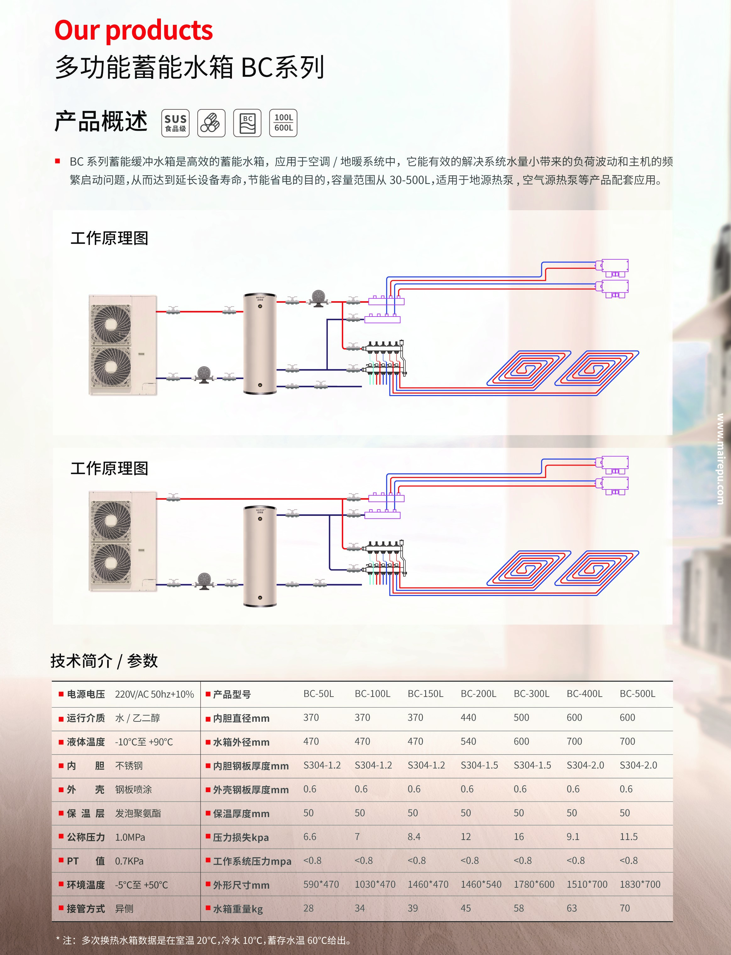 ● BC 系列蓄能緩沖水箱是高效的蓄能水箱,應用于空調/ 地暖系統中,它能有效的解決系統水量小帶來的負荷波動和主機的頻繁啟動問題,從而達到延長設備壽命,節能省電的目的,容量范圍從 30-500L,適用于地源熱泵,空氣源熱泵等產品配套應用