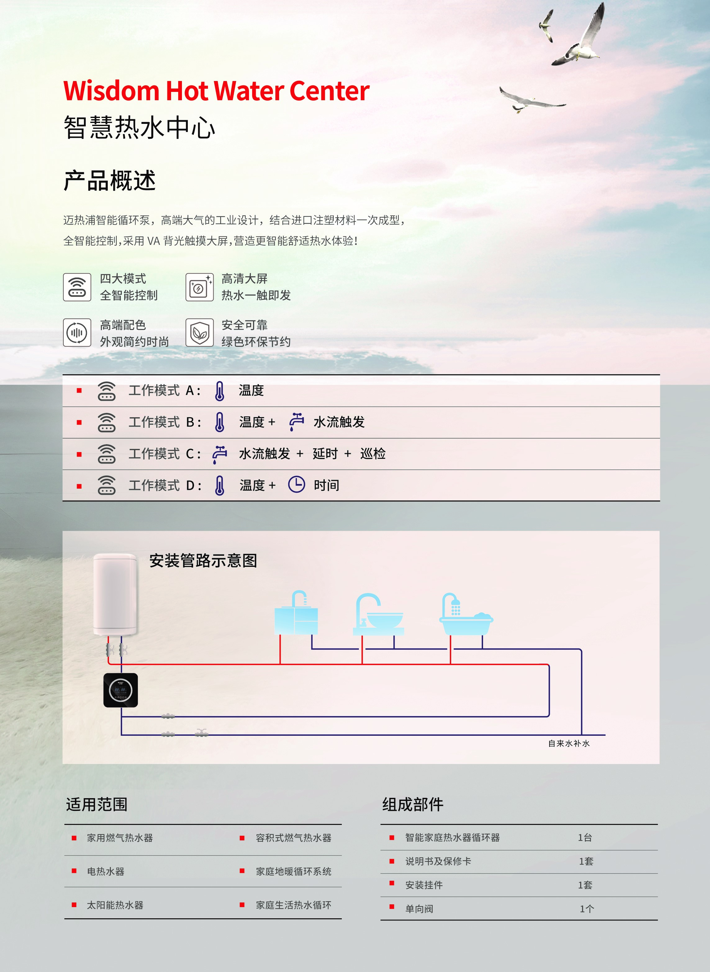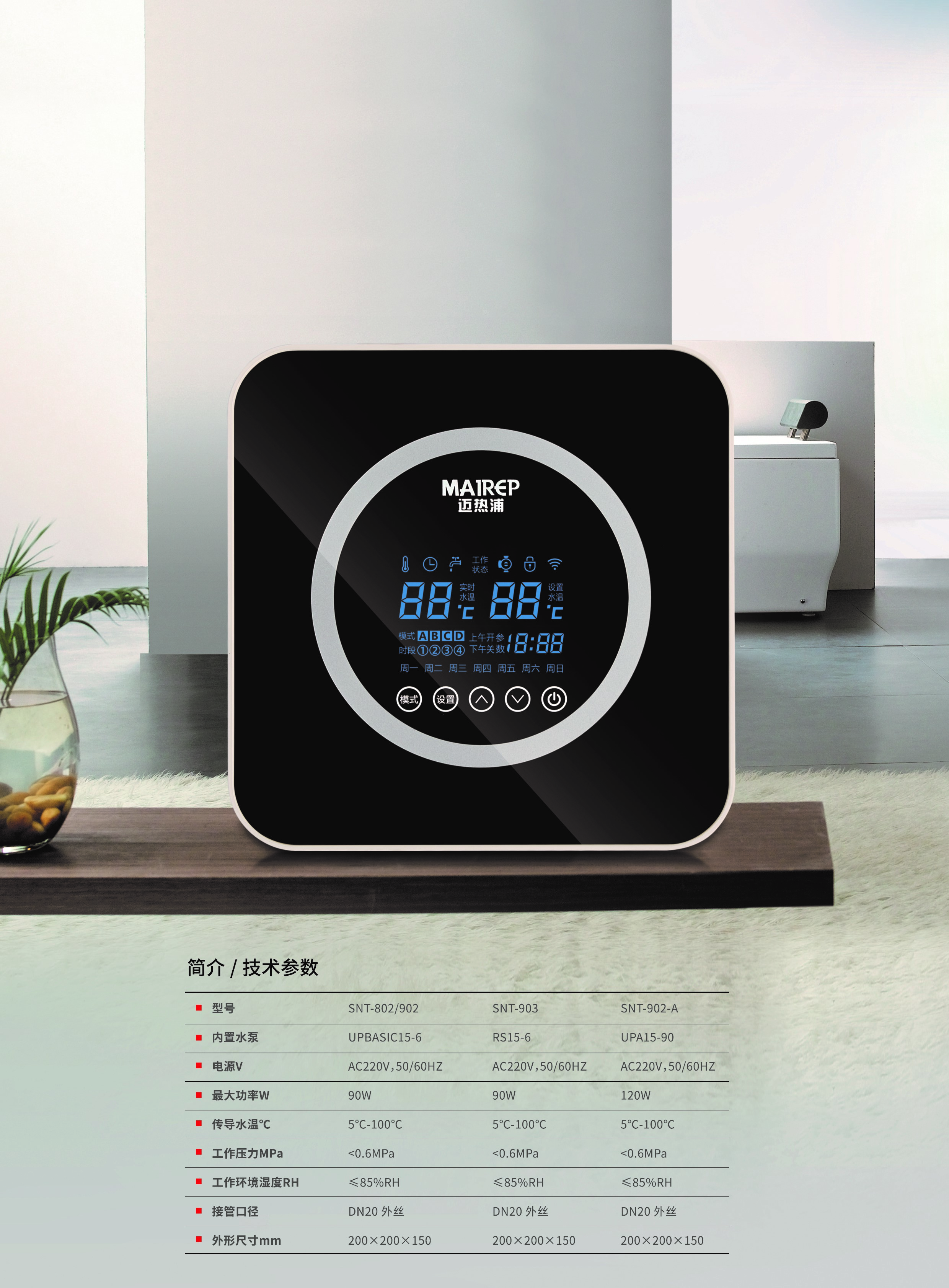 邁熱浦智能循環泵,高端大氣的工業設計,結合進口注塑材料一次成型,全智能控制,采用VA背光觸摸大屏,營造更智能舒適熱水體驗!