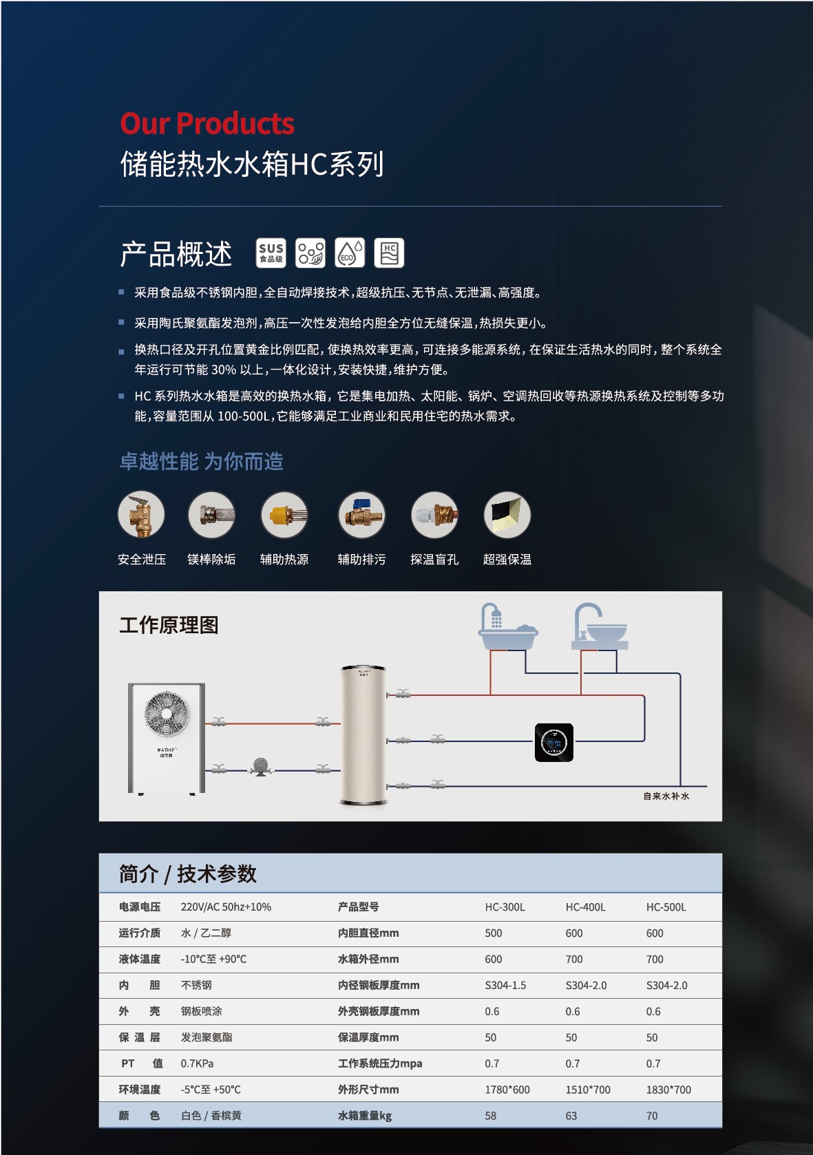 ● HC 系列熱水水箱是高效的換熱水箱,它是集電加熱、太陽能、鍋爐、空調熱回收等熱源換熱系統及控制等多功能容量范圍從 100-500L,它能夠滿足工業商業和民用住宅的熱水需求。