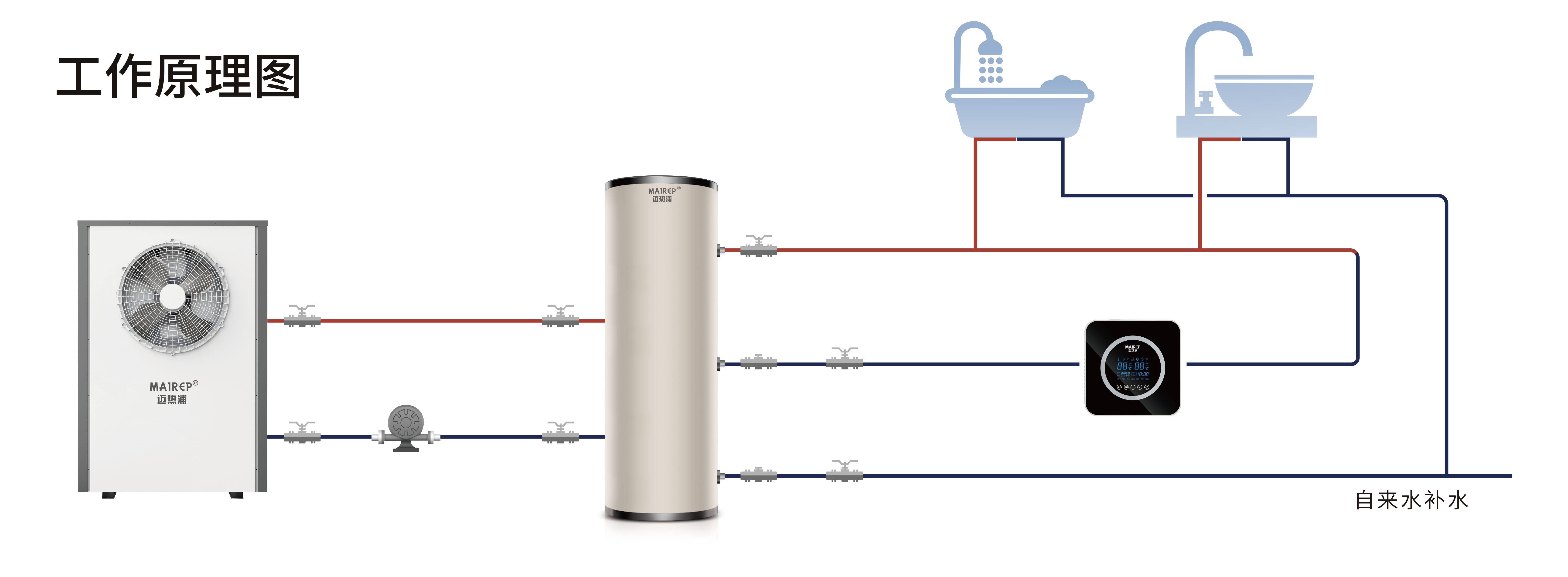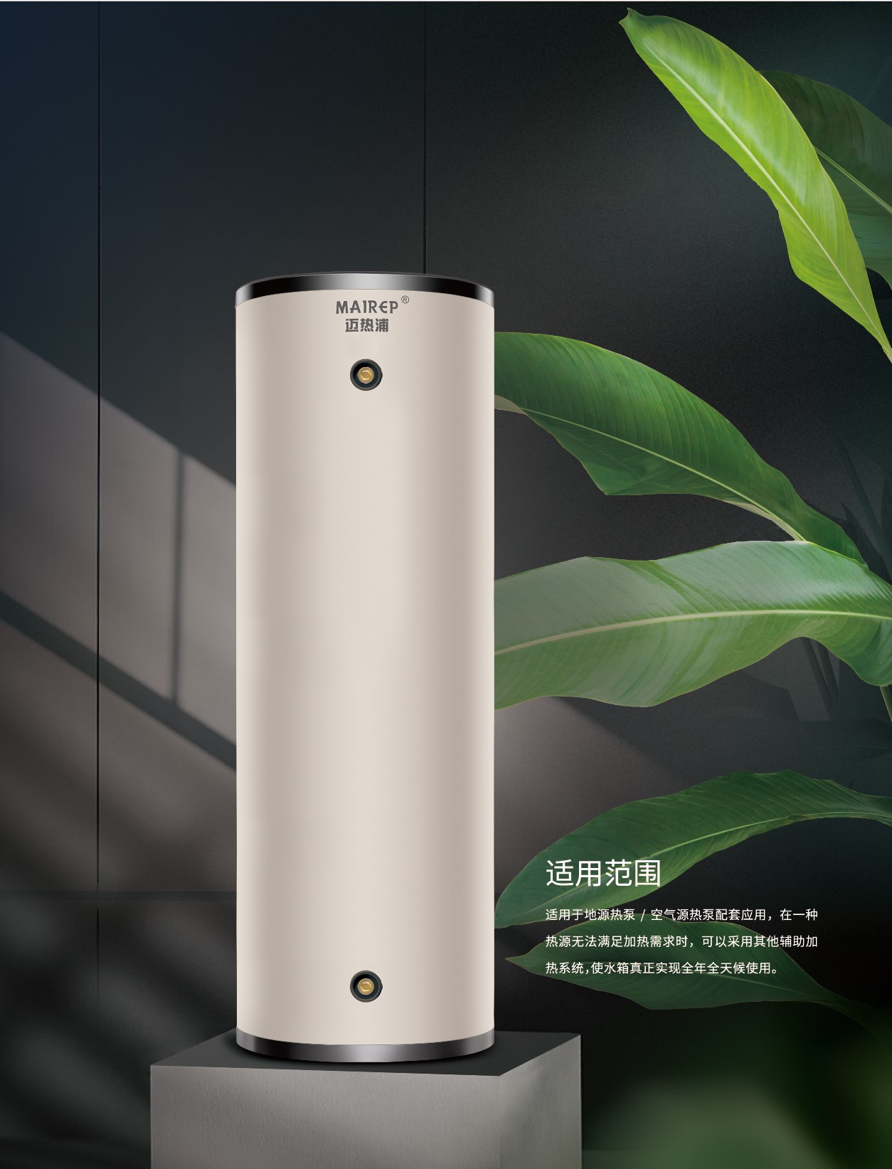 適用于地源熱泵 /空氣源熱泵配套應用,在一種熱源無法滿足加熱需求時,可以采用其他輔助加熱系統,使水箱真正實現全年全天候使用。