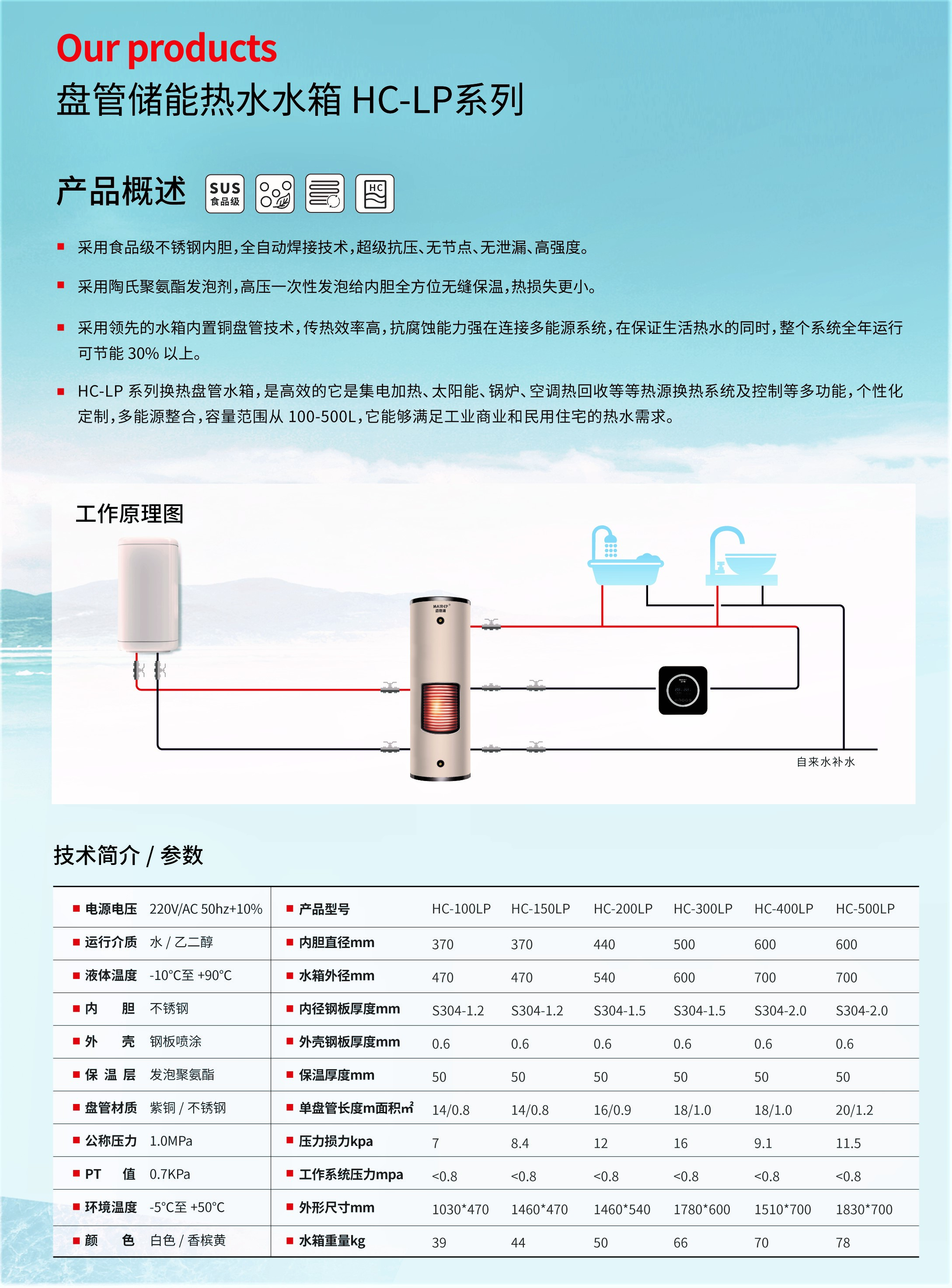 ● HC-LP 系列換熱盤管水箱,是高效的它是集電加熱、太陽能、鍋爐、空調(diào)熱回收等等熱源換熱系統(tǒng)及控制等多功能,個(gè)性化定制,多能源整合,容量范圍從 100-500L,它能夠滿足工業(yè)商業(yè)和民用住宅的熱水需求。